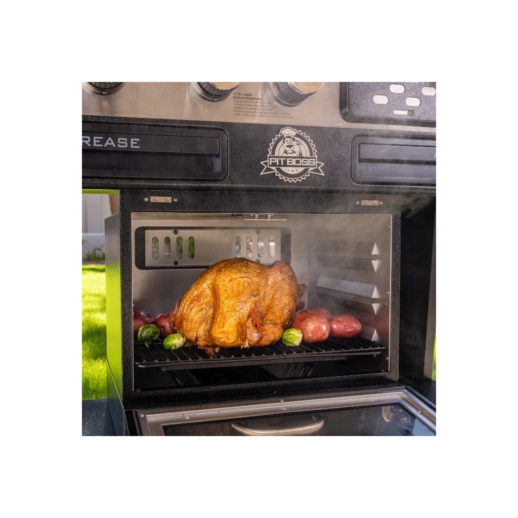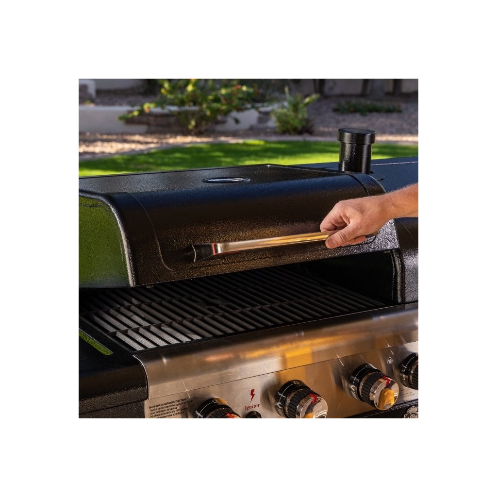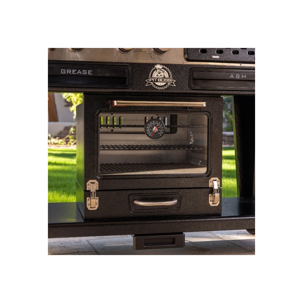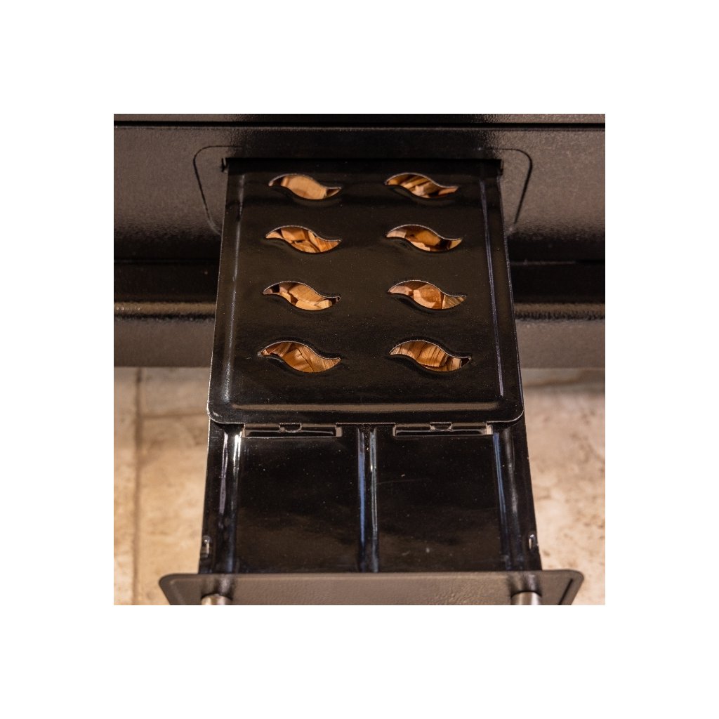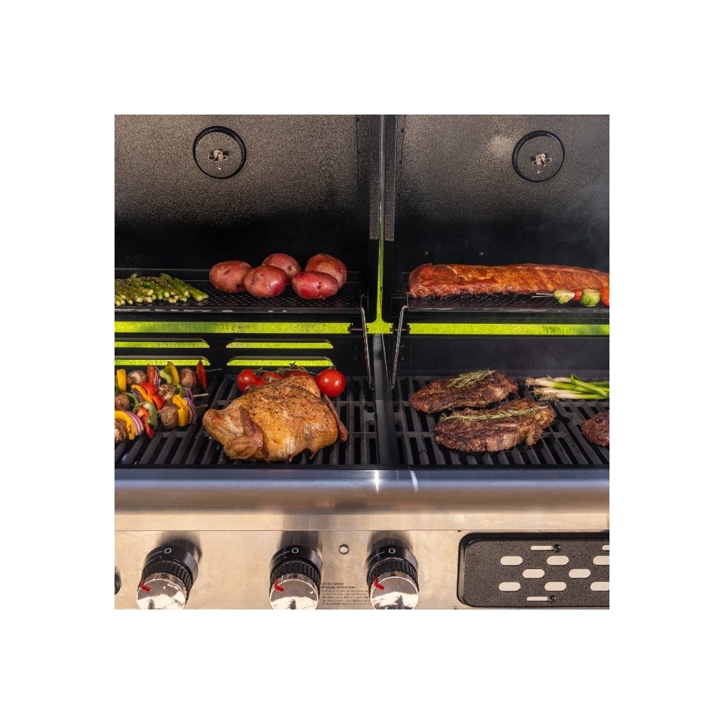 Jeden stroj na všetko: plynový gril, gril na drevené uhlie a elektrická udiareň s presklenými dvierkami. Dve úplne nezávislé grilovacie komory, 3 plynové horáky (8,79 kW) a udiareň, ktorá zvládne studné údenie od 45 °C aj pečenie do 230 °C.