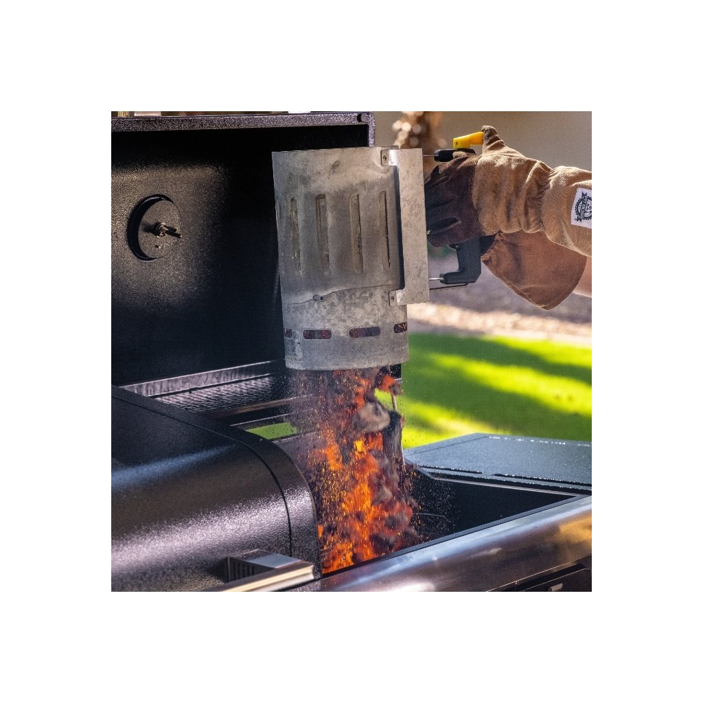 Uhlíková časť griluje na masívnych liatinových roštoch, teplotu reguluješ prívodom vzduchu a vo veku je teplomer. Uhlie ide do železného košíka a výšku košíka vieš nastaviť páčkou v 6 pozíciách, takže si vieš pekne doladiť intenzitu žiaru podľa toho, či ideš searovať alebo robiť low and slow.